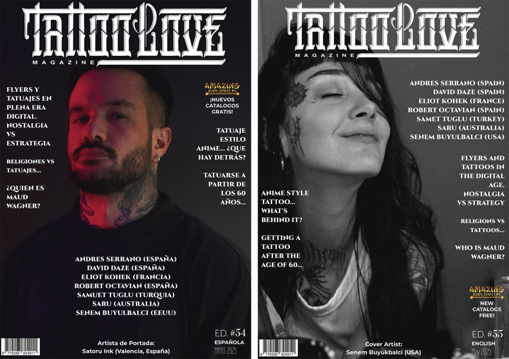 Te presentamos las ediciones 54 (ed. española) y 55 (ed. inglesa) de las revistas Tattoo Love de mayo 2025.