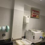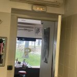 Todas las salas tienen aire acondicionado y mobiliario de acero inoxidable a medida con grifos de pedal y espejos en todas las paredes.