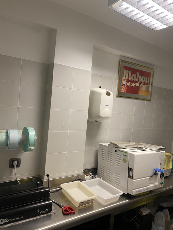 Tiene 72 m2 útiles divididos en dos amplias salas independientes con una ventana directa a la sala de limpieza y esterilización la cual dispone de autoclave automático, selladora y ultrasonidos.